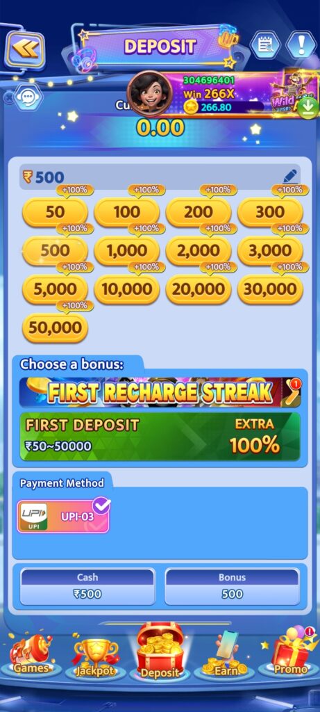 doston yah game me first deposit karna chahte hai to 50 rupya se lekar 50000 hazzar rupya tak kar sakate hai 50 rupya ka recharge par aapko 100% extra bonus price milata hain is bonus se bhi aap khel kar bahut sare rupya ko earn kar sakate hain.